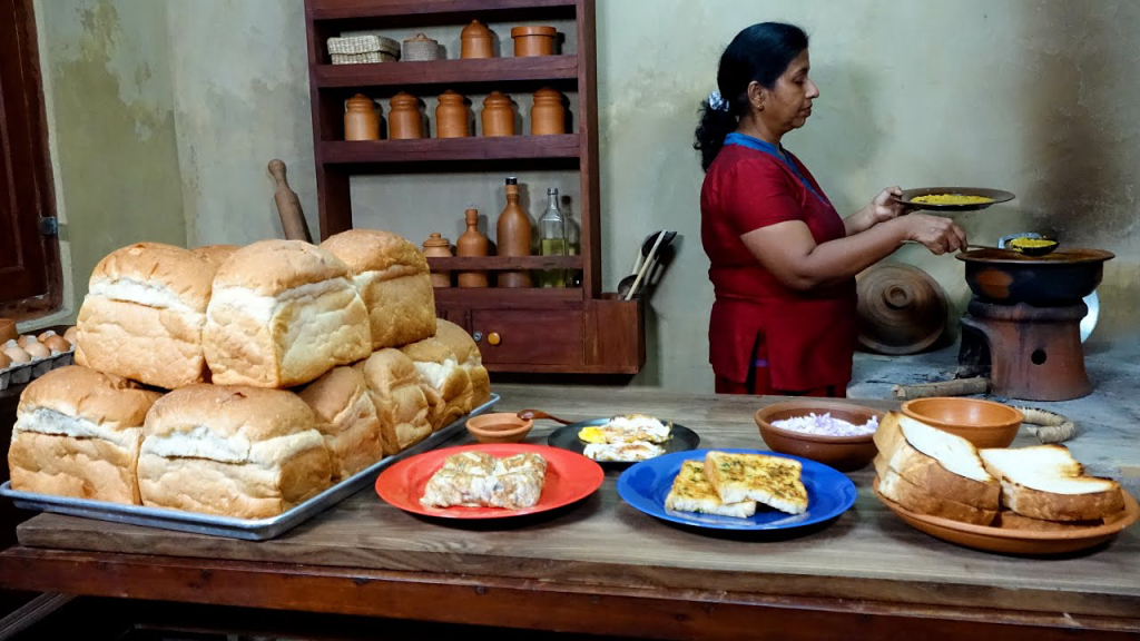 Place a flat pan (tawa) on the wood-fired stove and let it heat up. Slice 4-6 pieces of bread from a loaf. Place two slices of bread on the hot tawa. Toast each side until golden brown and slightly crispy. Remove the toasted bread from the tawa and set aside.